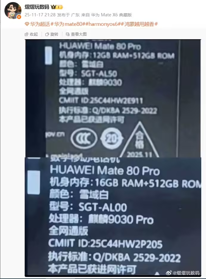 此外,华为 Mate 80 Pro 系列手机的包装盒也已曝光,新机 12GB 运存版本(型号 SGT-AL50)与 16GB 运存版本(型号 SGT-AL00)的处理器略有差异,分别搭载麒麟 9030 和麒麟 9030 Pro 处理器。