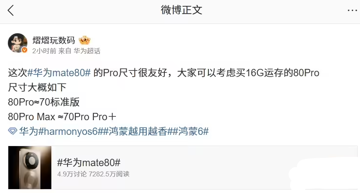 博主 @熠熠玩数码 发文透露,称华为 Mate 80 Pro 系列手机尺寸很友好,大致如下: