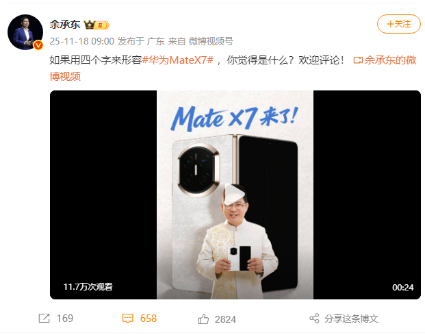 华为 Mate 80 系列 | Mate X7 及全场景新品发布会已经官宣 11 月 25 日 14:30,其中 Mate X7 宣传口号为“光织云锦,卓然出众”“越展开越心动”。