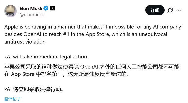马斯克指控称,苹果与 OpenAI 的排他性合作关系导致其他 AI 公司无法在 App Store 中公平竞争,构成了垄断行为。