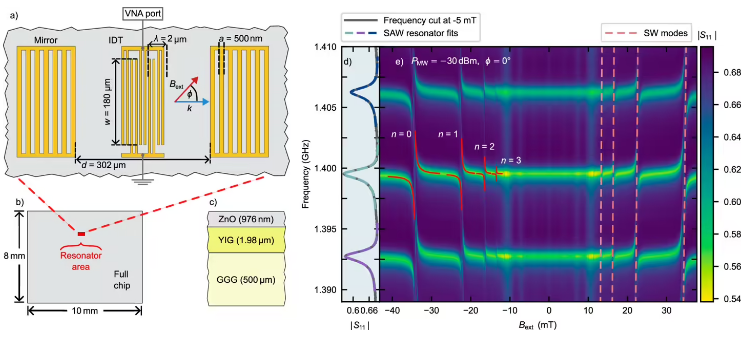 在纳米结构的声表面谐振器中,研究人员观测到了一种名为“磁子极化子(magnon polarons)”的混合激发态。