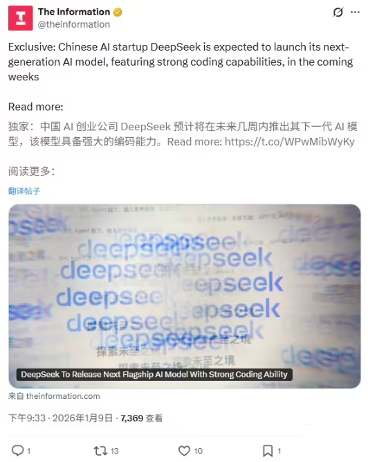 The Information 报道称,DeepSeek 将在今年 2 月中旬农历新年期间推出新一代旗舰 AI 模型 ——DeepSeek V4,将具备更强的写代码能力。