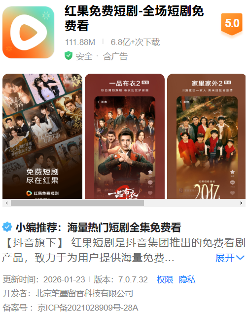 据 Tech 星球昨晚报道,2026 年 1 月,字节跳动旗下红果短剧 App 日活已经过亿,成为继今日头条、抖音、豆包、番茄小说之后,字节第五款日活过亿的独立 App。