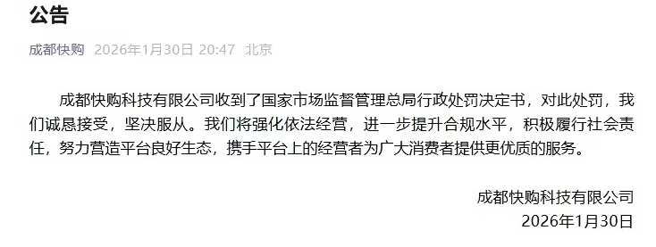成都快购科技有限公司收到了国家市场监督管理总局行政处罚决定书,对此处罚,我们诚恳接受,坚决服从。我们将强化依法经营,进一步提升合规水平,积极履行社会责任,努力营造平台良好生态,携手平台上的经营者为广大消费者提供更优质的服务。