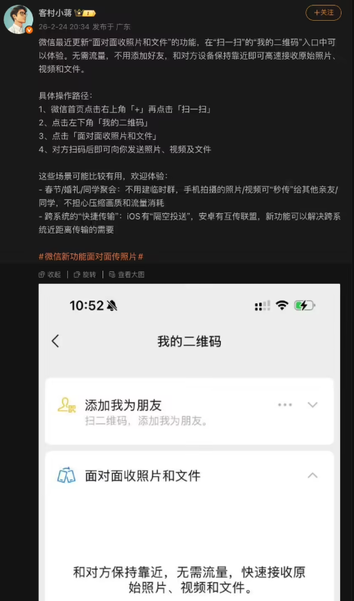 微信员工 @客村小蒋 在微博发文,详解微信最近更新的“面对面收照片和文件”功能,不需要使用流量、添加好友,只需要保持设备靠近就能高速接收原始照片、视频和文件。