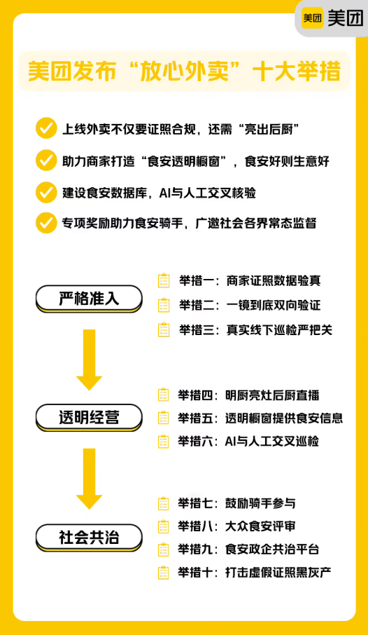 同日,美团发布“放心外卖”十大举措,宣布全面升级外卖食品安全治理体系,围绕“商家准入、透明经营、多方共治”三个环节推进。