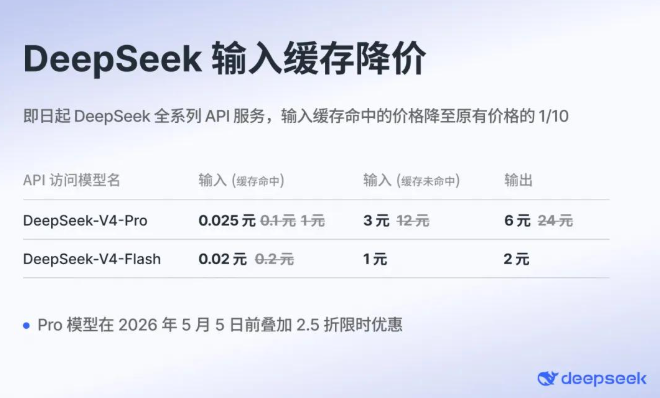 Pro版本API价格限时2.5折,优惠期持续到5月5日。紧接着,Pro和Flash的输入缓存命中价格一步到位,打到原价的十分之一。