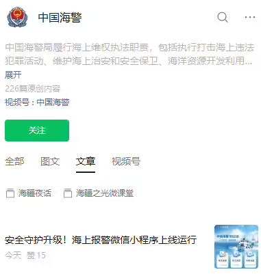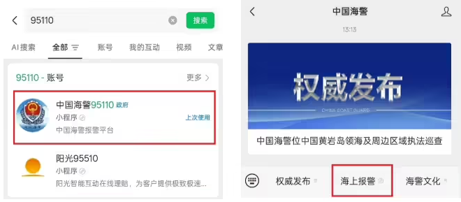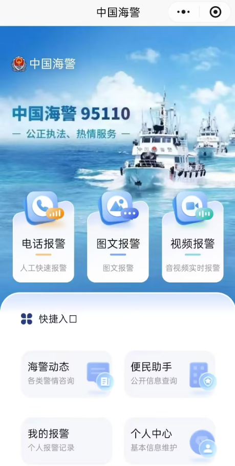 公众可通过微信搜索“中国海警 95110”或关注“中国海警”公众号进入该程序,实现实时定位报警位置,并选择文字、图片、音视频及视频通话方式提交警情。