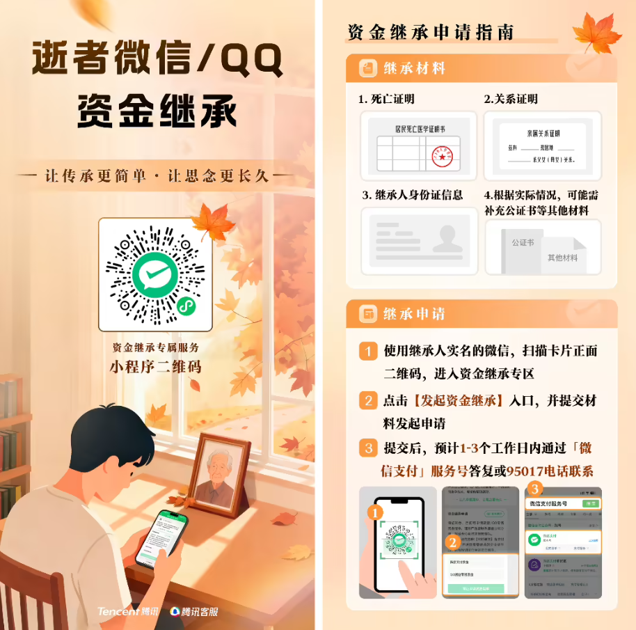 据新华社今日报道,腾讯客服已升级逝者微信及 QQ 零钱资金继承专属服务。在材料完备的情况下,逝者零钱资金一般一到三个工作日、最快 24 小时可完成提取。
